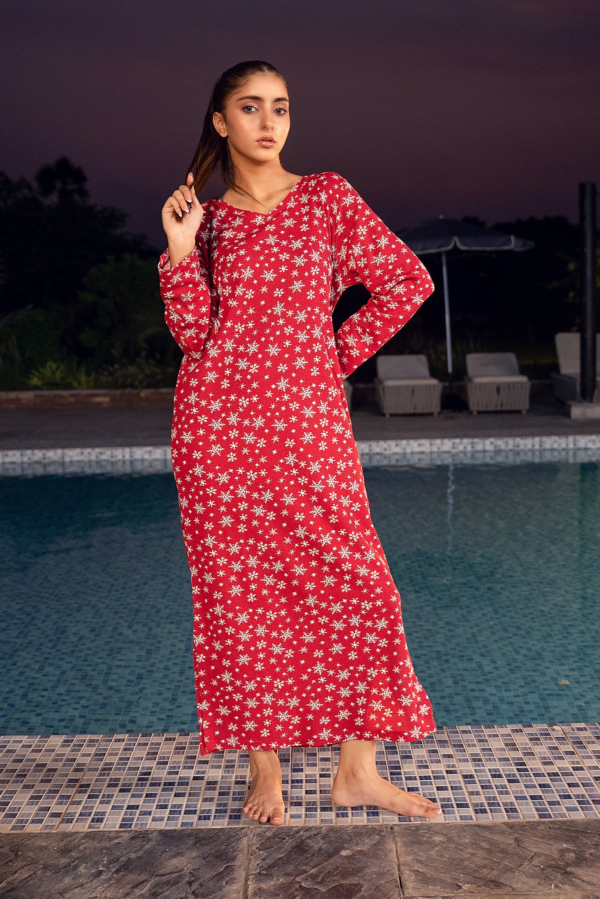Stay warm in style with our Red Snowflake Thermal Nightdress, designed for cozy winter nights. Made from premium thermal fabric, it offers softness, breathability, and lasting warmth. The elegant side slit and full sleeves create a comfortable yet flattering fit, while the delicate snowflake print adds a festive winter charm. Perfect for bedtime, lounging, or chilly evenings at home.