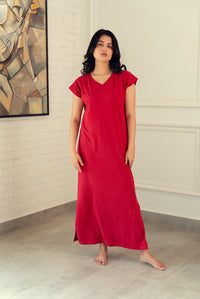 Drift into comfort with our Ruby Nightdress — a soft cotton long nightdress in a rich red shade, designed with a relaxed fit, V-neckline, and side slit for easy movement. Ideal for cozy nights and peaceful mornings.