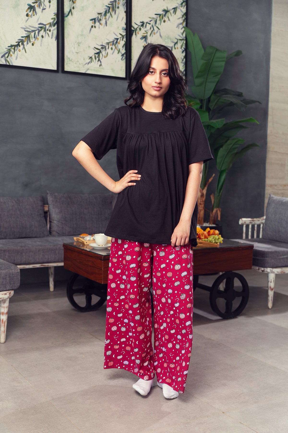 Unwind in cozy comfort with our Berry Pumpkin Cotton PJ Set. Crafted from soft, breathable cotton jersey, this set features a relaxed black gathered tee paired with berry-red trousers adorned in a playful pumpkin print. Perfect for cozy nights, slow mornings, or lounging in style, it brings together comfort, cuteness, and effortless charm in every wear.